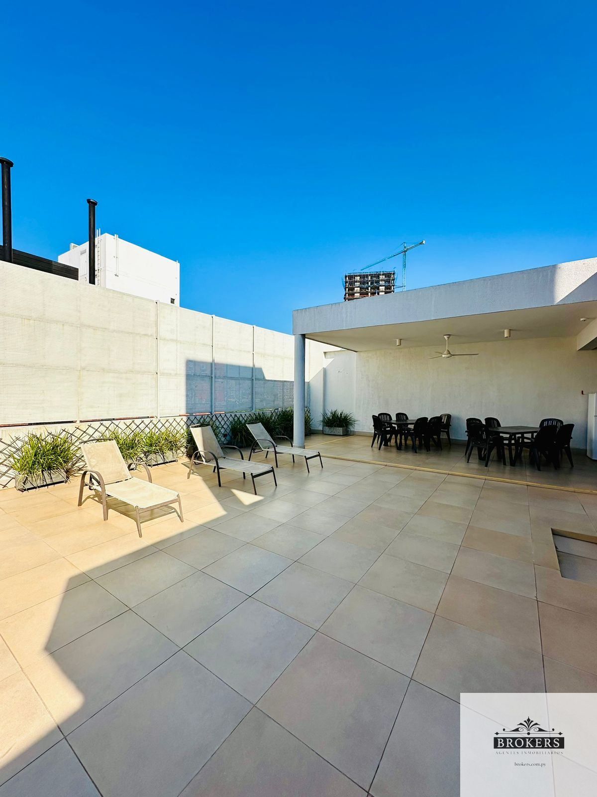 El edificio cuenta con una terraza con piscina y parrilla, gym, ascensor, portero 24hs, generador que abastece el ascensor y portón eléctrico, y cámaras de seguridad.