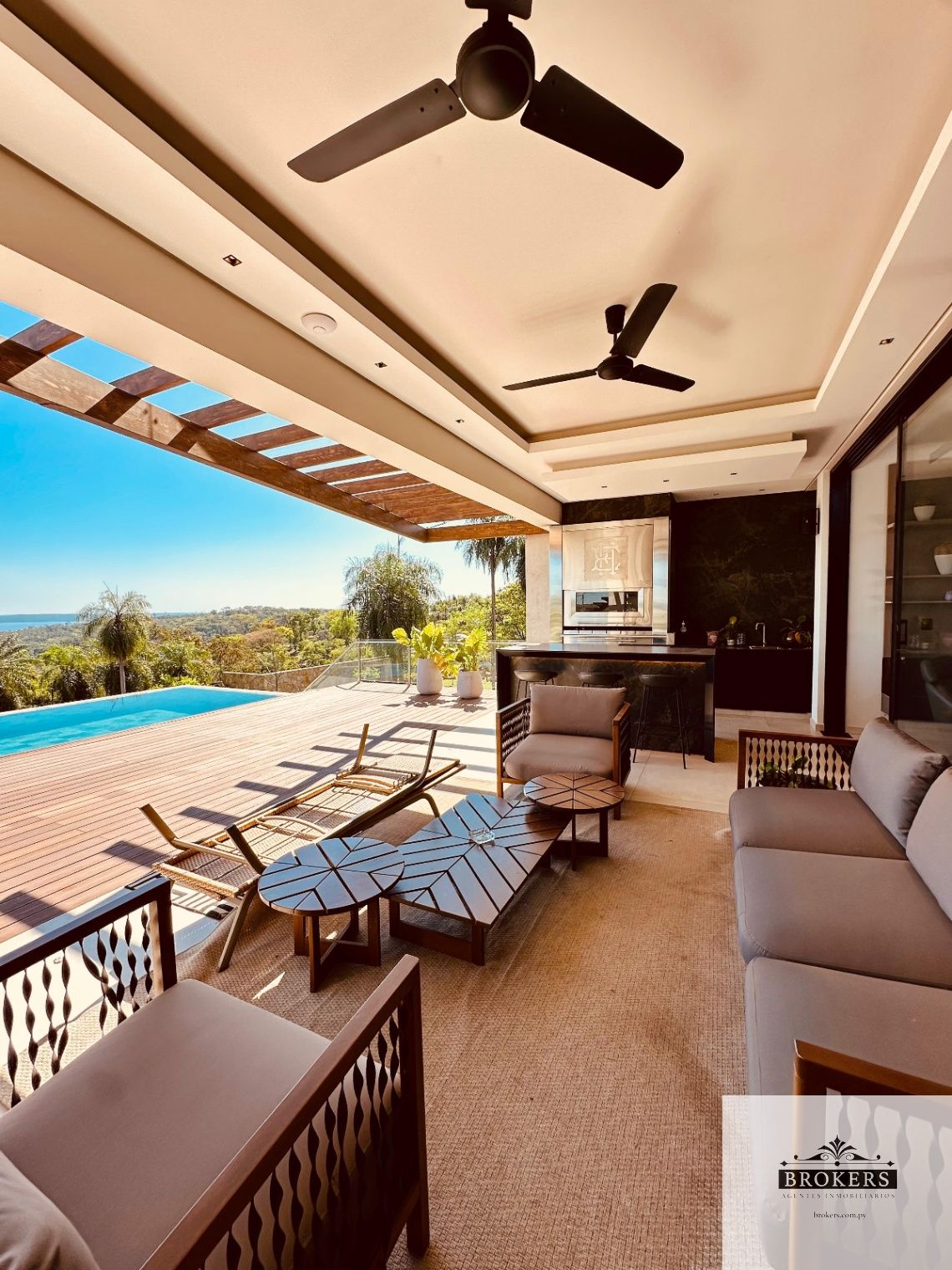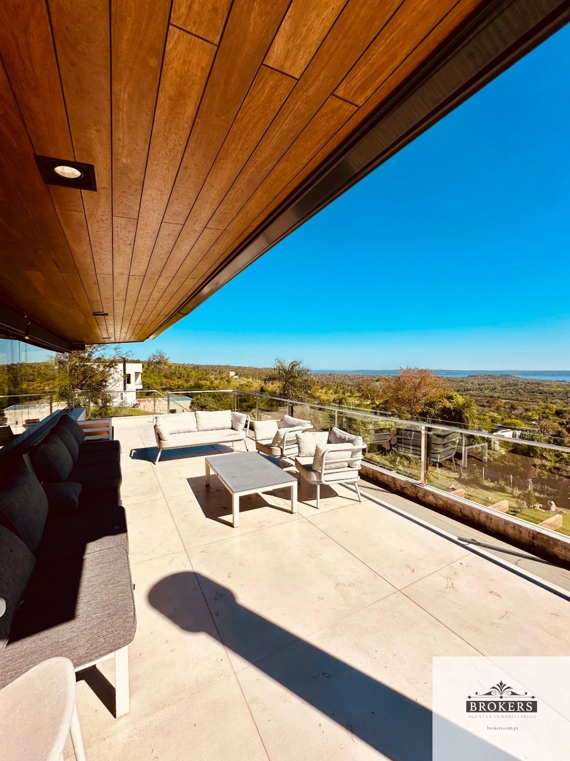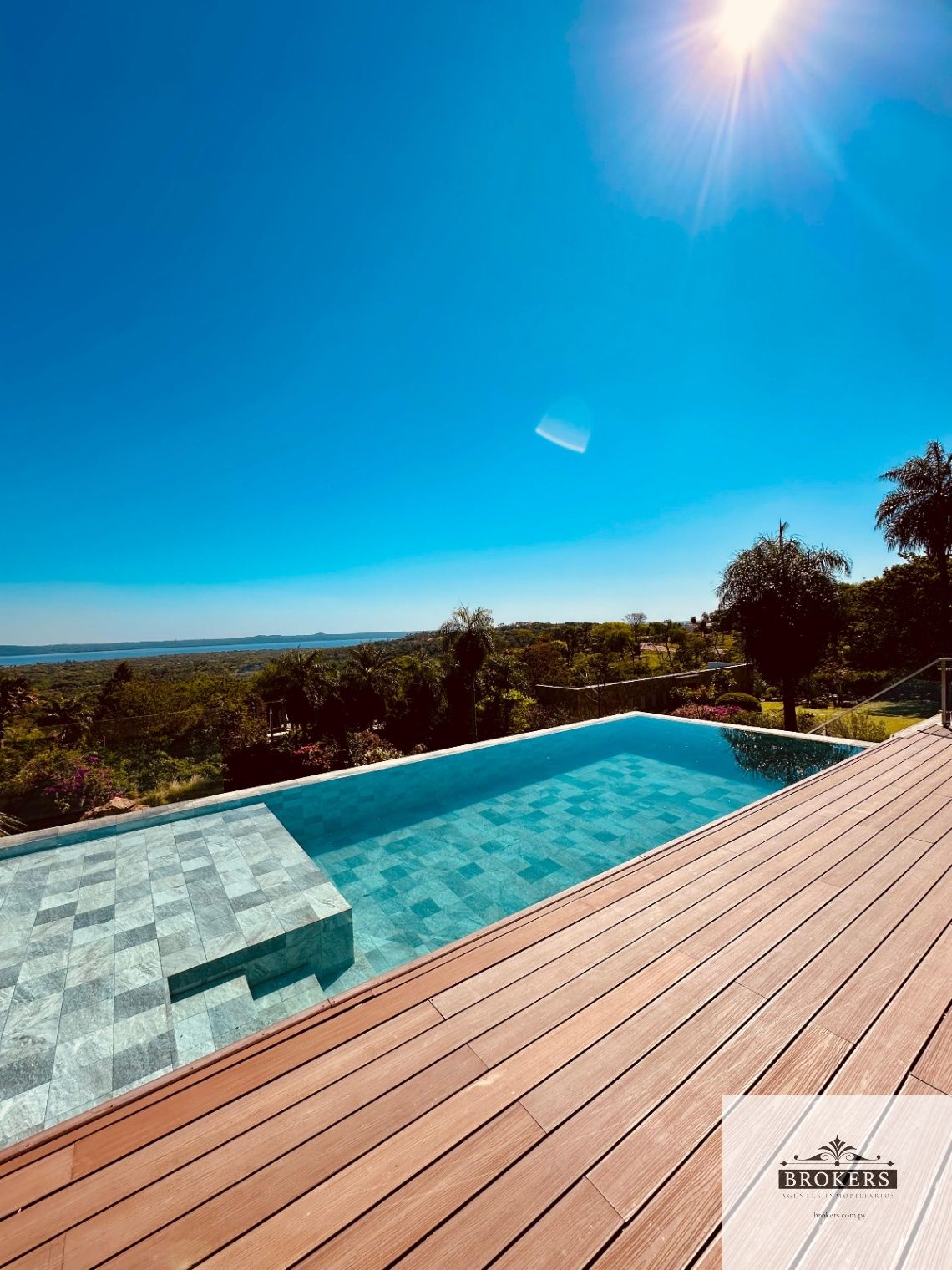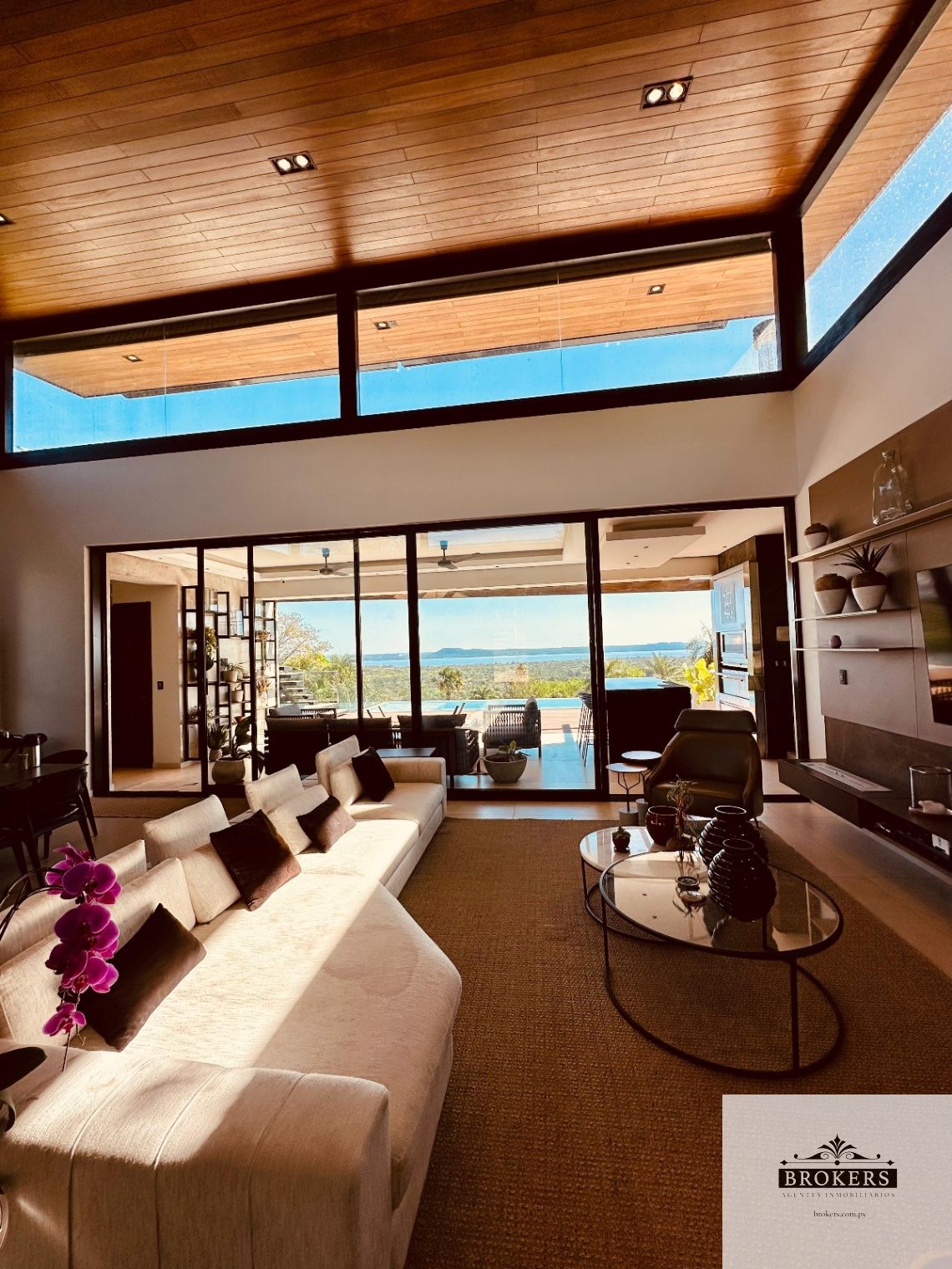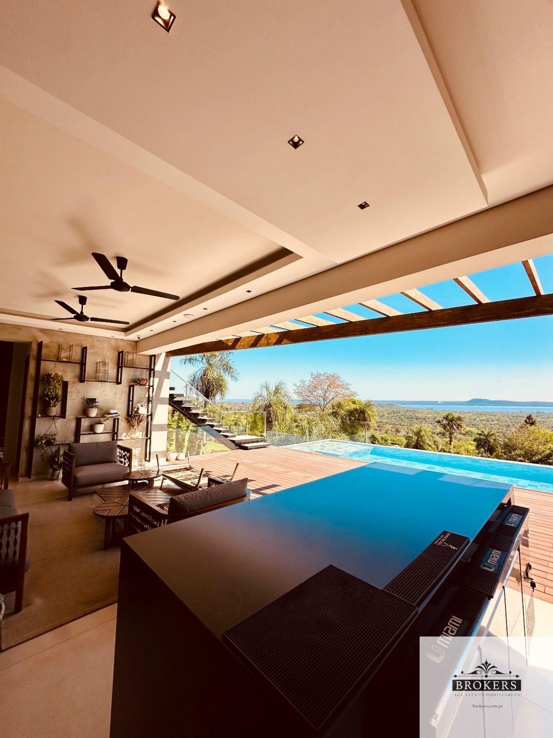 Espacio para 4 vehículos aprox, sala comedor, estar de TV integrada, baño social, cocina integrada, quincho con parrilla, piscina panorama con vista al lago, baño quincho.