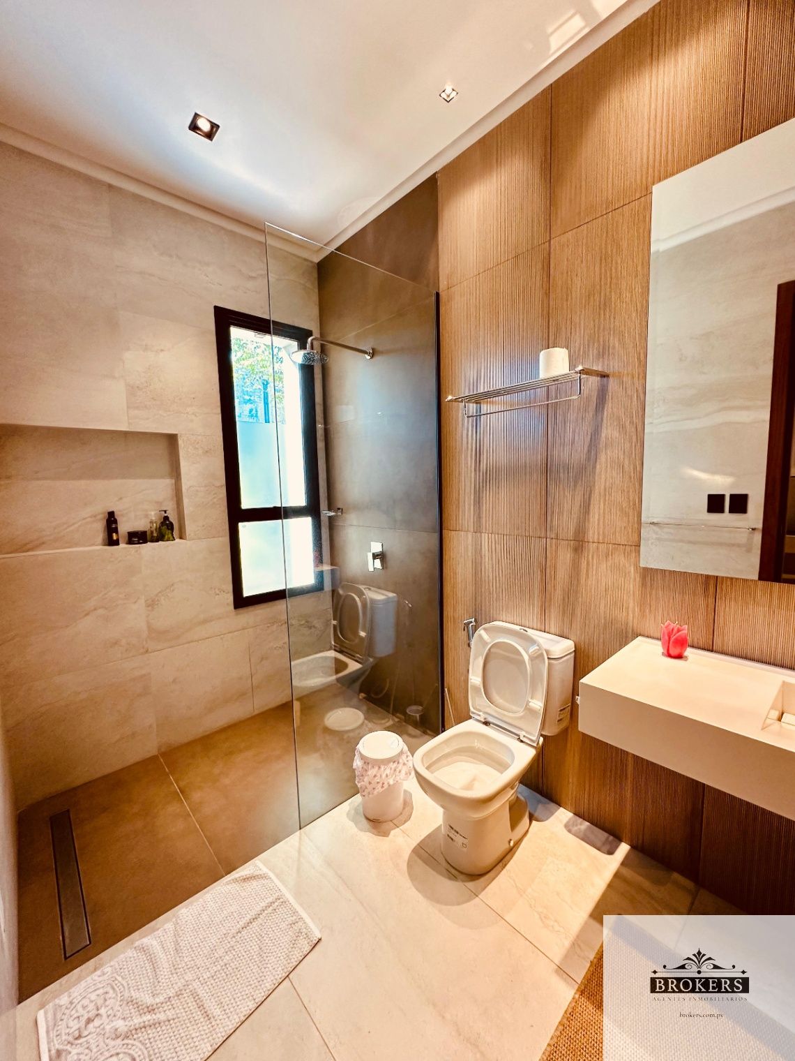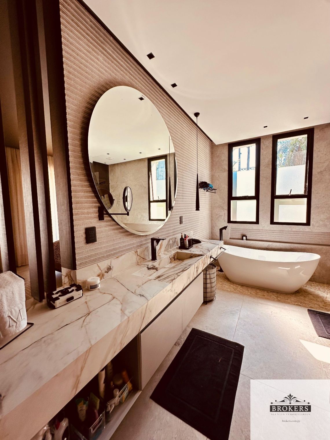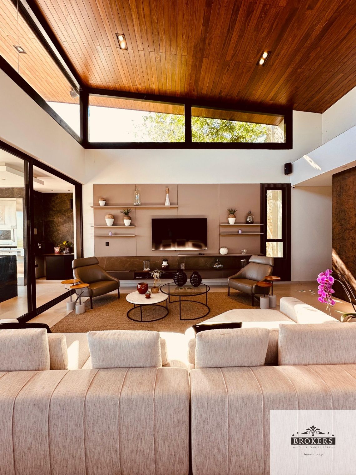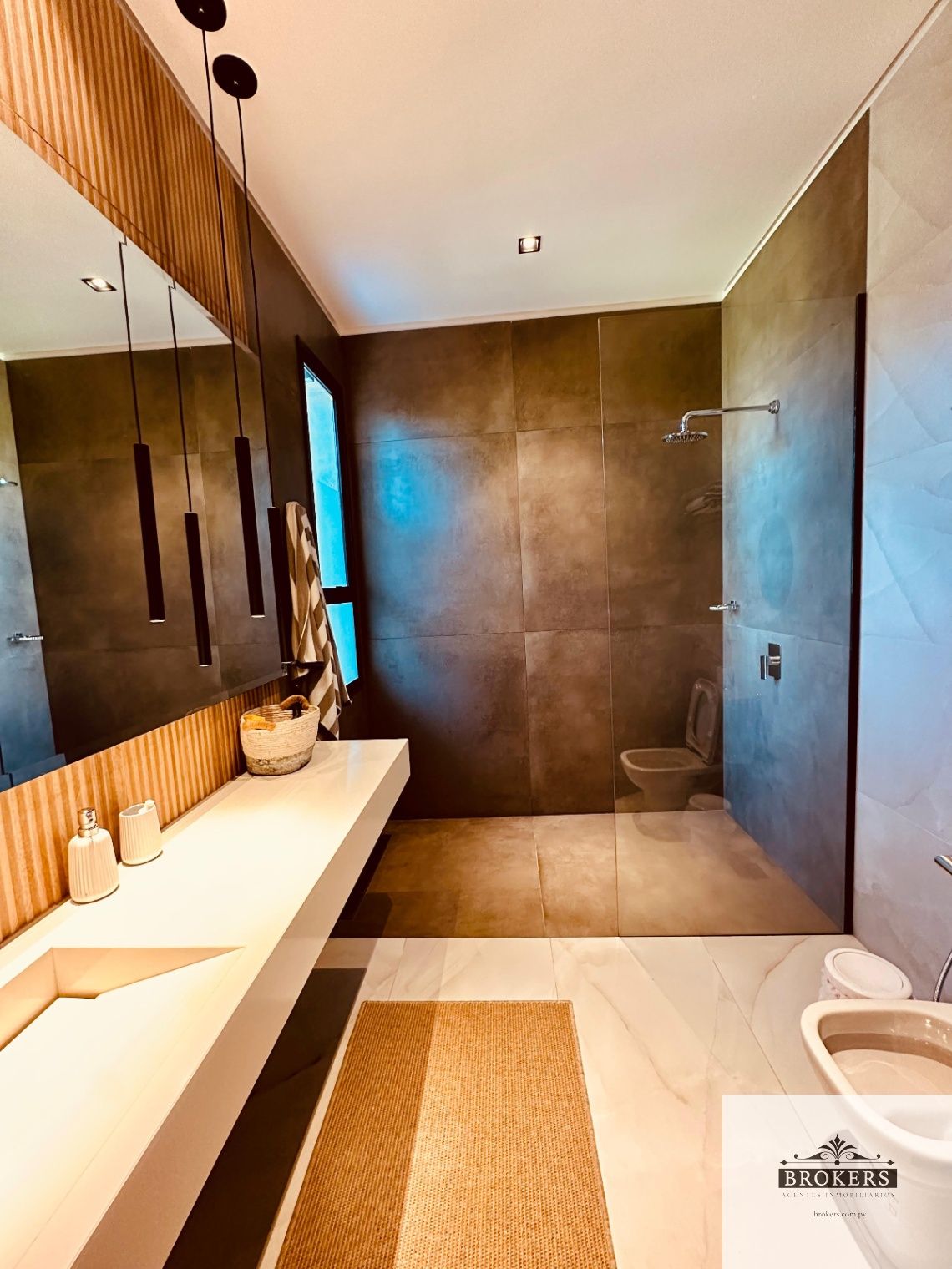 Nivel inferior: Sala de estar, 3 dormitorios principales en suite, la master suite con ante baño, tina y vestidor, la habitación principal tiene salida al patio y área de servicio completa con lavadero y baño.