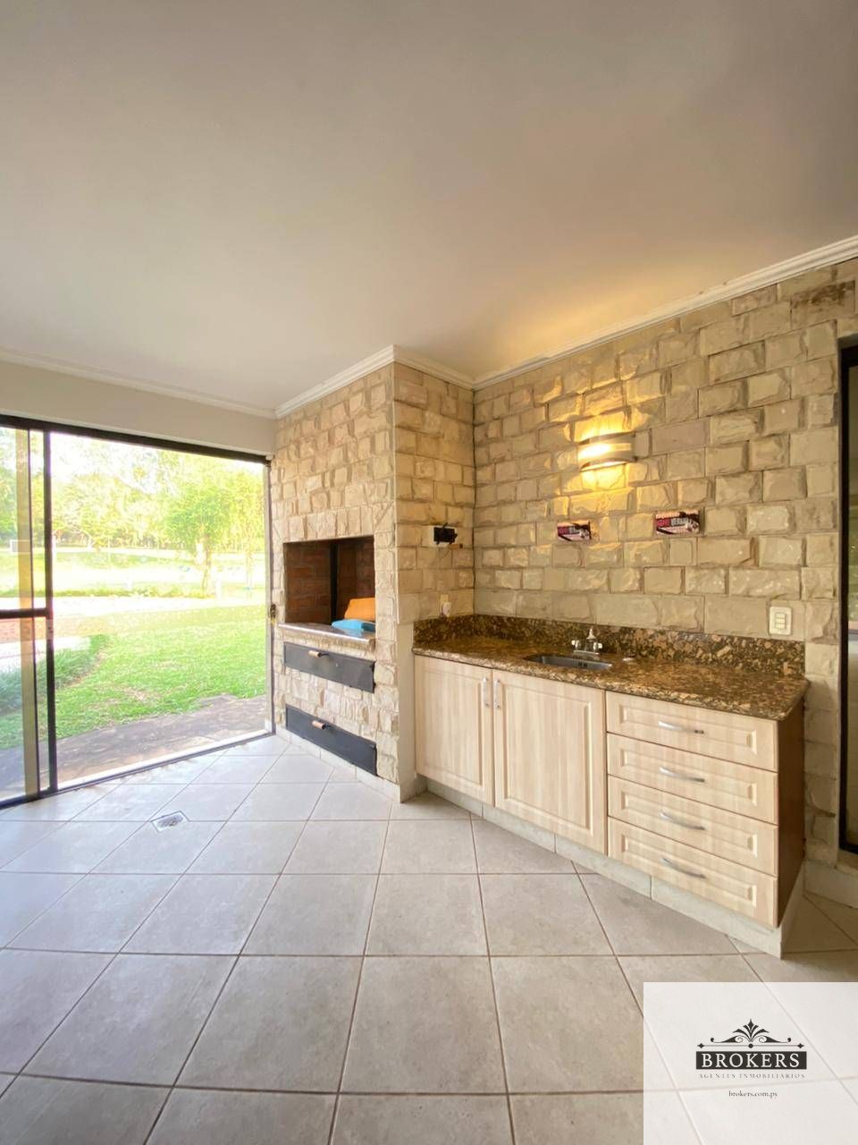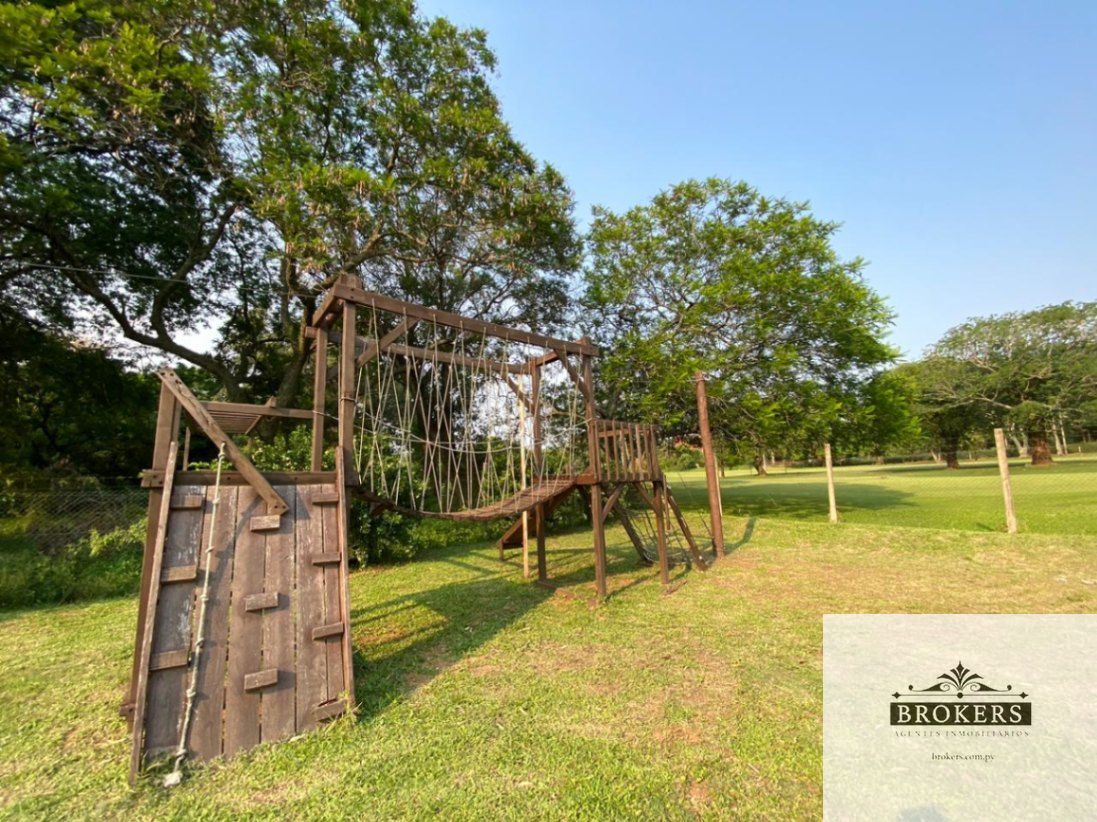 Hermoso jardín, áreas recreativas y una cancha de fútbol u otros deportes y Quincho techado con parrilla.