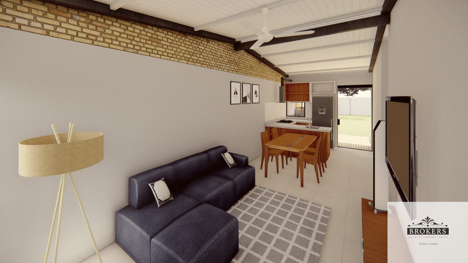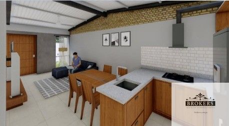 La casa cuenta con dos dormitorios y un baño familiar, Moderna cocina amoblada integrada a la sala comedor.