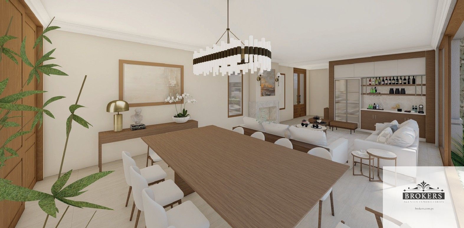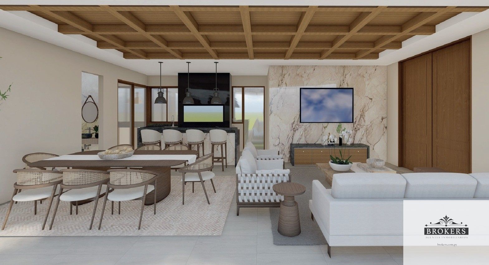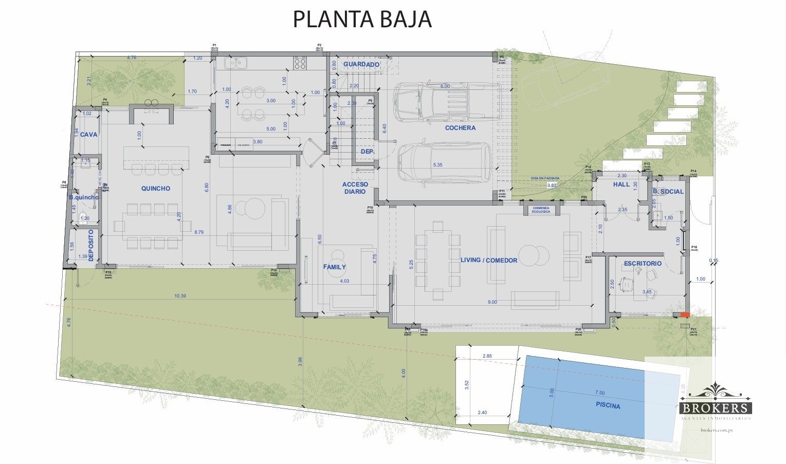 Planta Baja: hall de acceso, baño social, escritorio, living comedor, estar familiar, cocina amoblada, quincho, parrilla, depósito, patio con piscina, espacio para 2 camionetas.