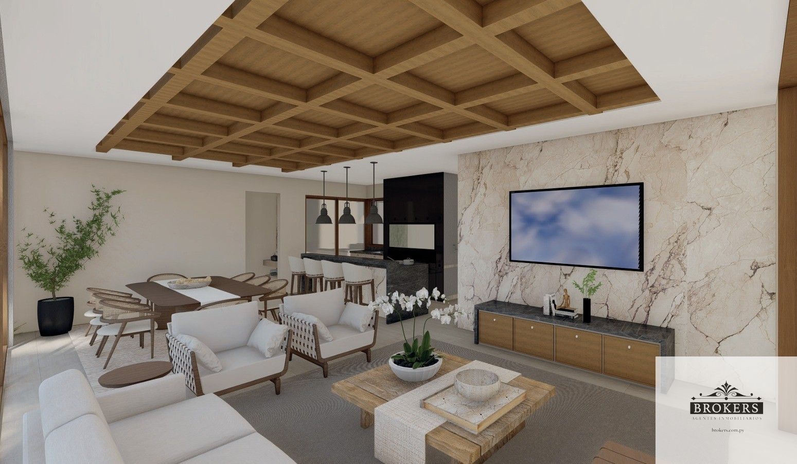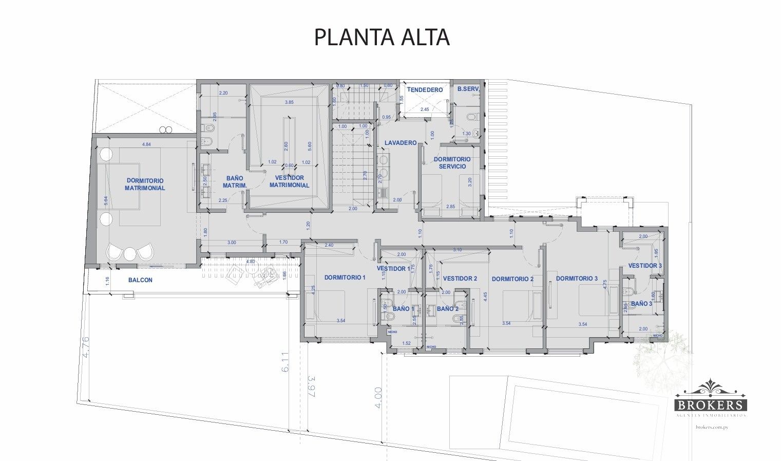 Planta Alta: 4 dormitorios en suite, 1 master suite, área de servicio con dormitorio, lavadero, tendedero y baño.