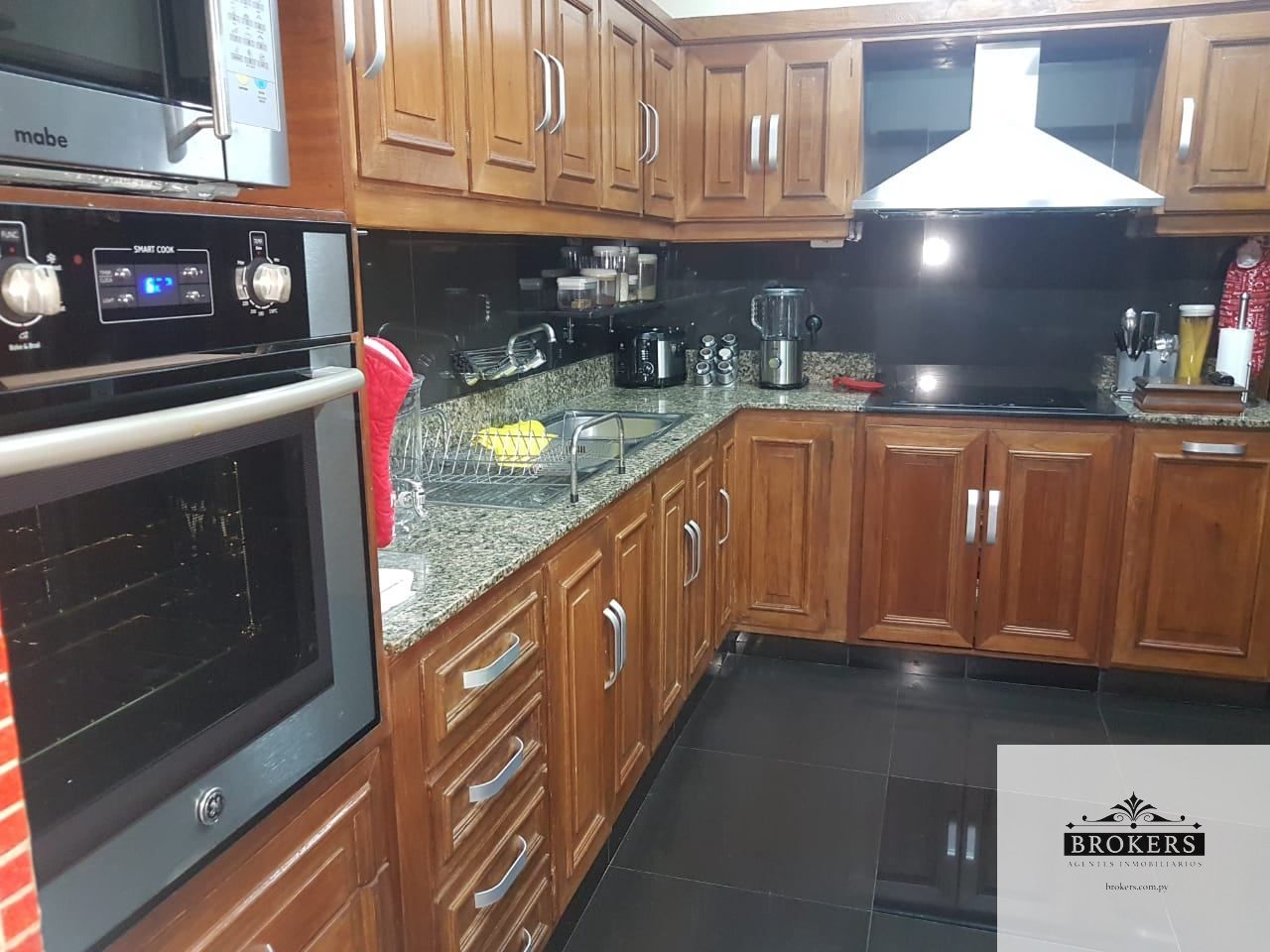 La cocina amoblada, con muebles de madera y desayunador, depósito, escritorio,