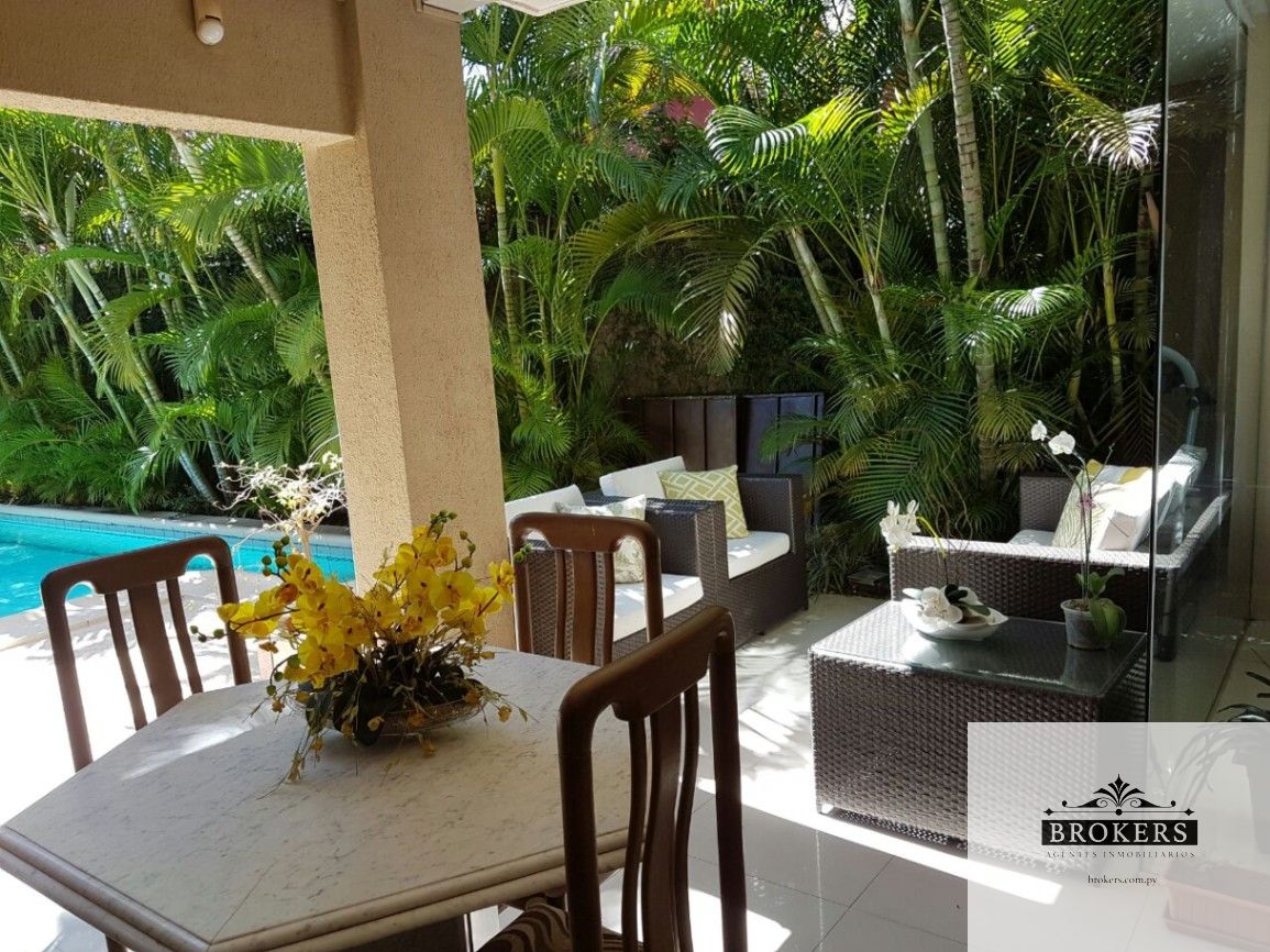 Un amplio living social con comedor, un baño social, y una sala de estar cerrada con vidrio que ofrece una vista impresionante al jardín y la piscina.