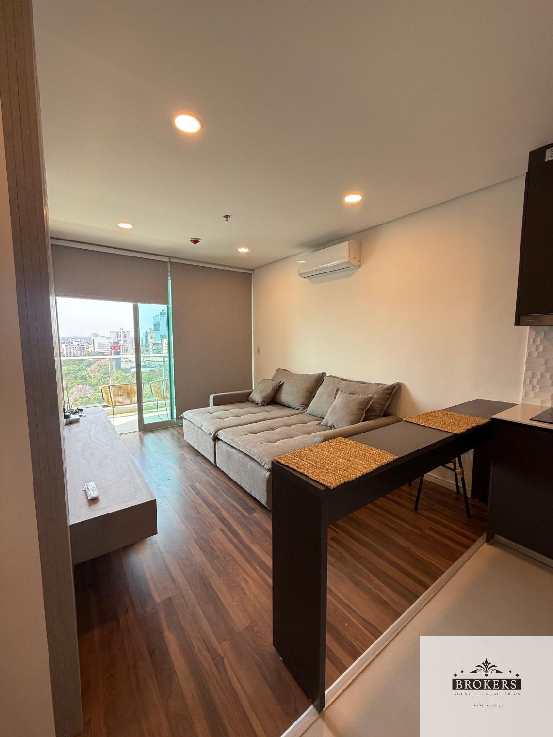 El departamento cuenta con living comedor, balcón con vista, cocina amoblada y equipada, un dormitorio, un baño familiar, una cochera.