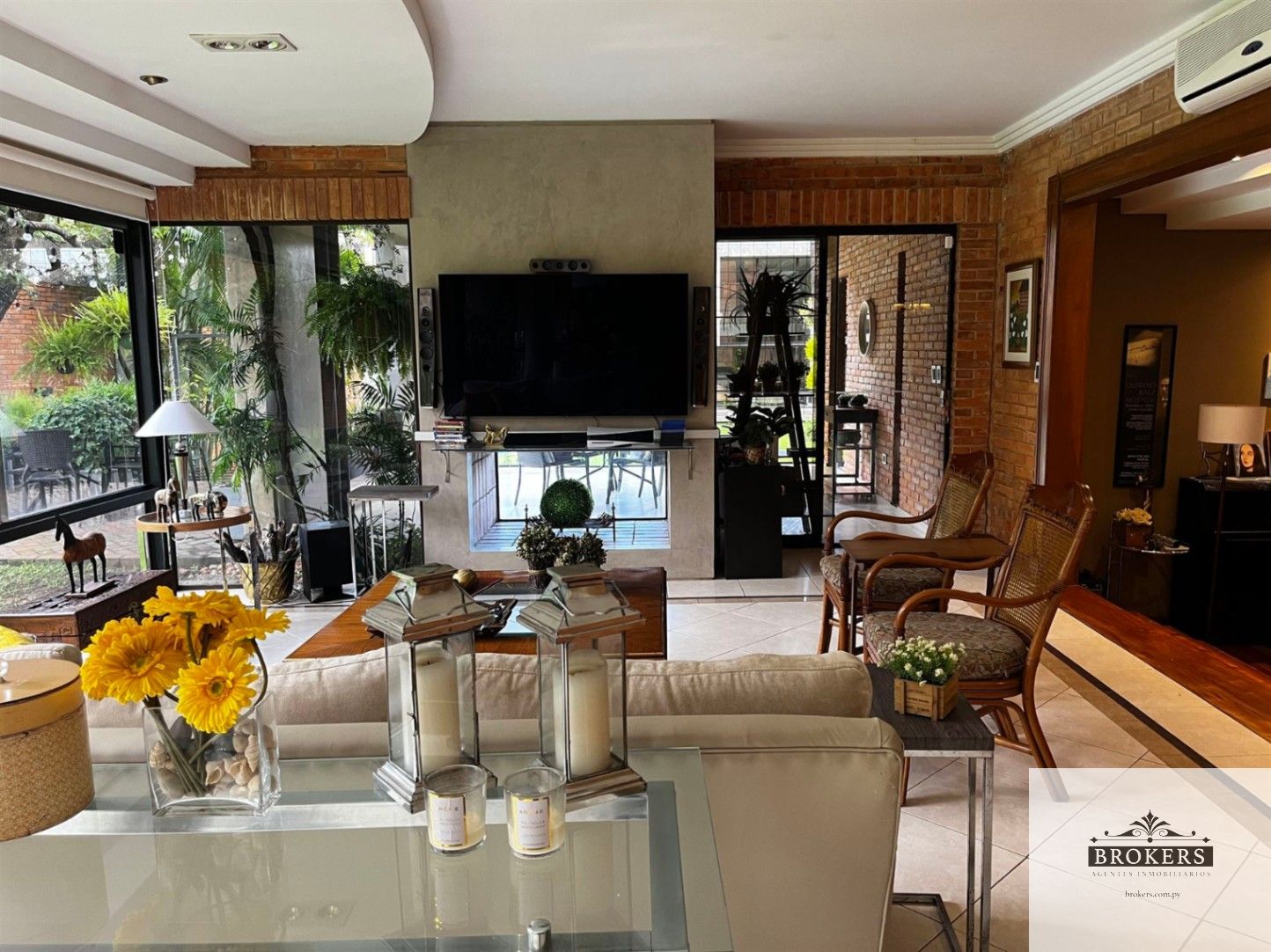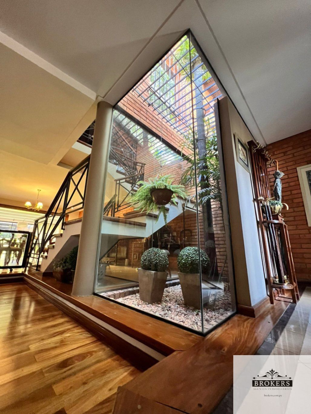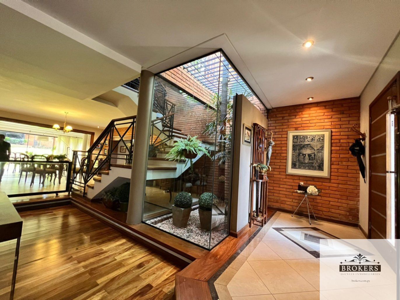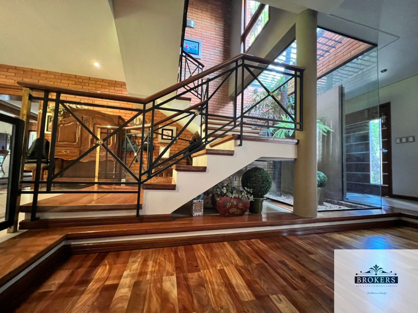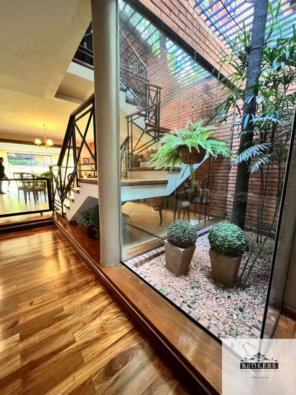 Planta Baja: Área social: sala de estar con piso parquet de madera yvyrapyta junto a patio interior, comedor social, segunda sala muy amplia también con piso
