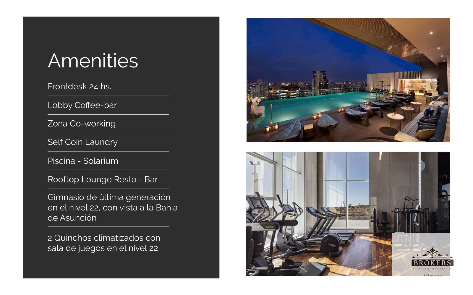 Amenities: Lobby Coffee bar, Zona Co-working, laundry, piscina, solarium, Gimnasio de ultima generación en el nivel 22, con vista a la bahía de Asuncion, 2 quinchos climatizados con sala de juegos en el nivel 22.