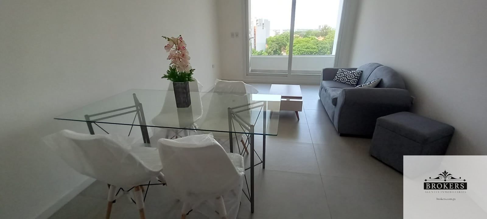 Sala comedor amoblada con balcón y parrilla eléctrica.
