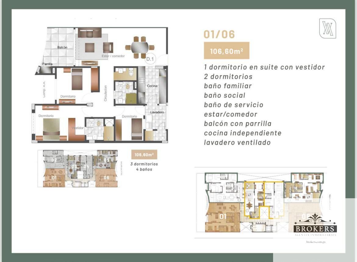 El departamento cuenta con tres dormitorios , uno en suite, vestidor, con placares y aire acondicionado.