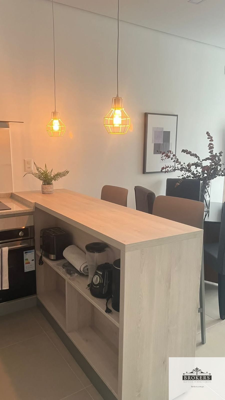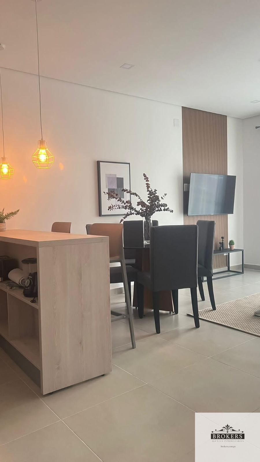 El departamento cuenta con living comedor, con cocina integrada amoblada y equipada con anafe, campana, horno eléctrico, baño social. dos dormitorios, balcón, una cochera.