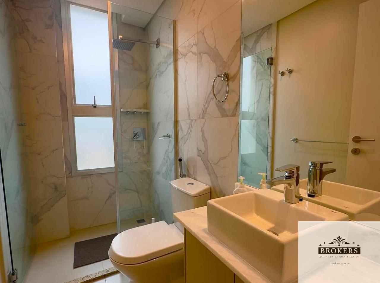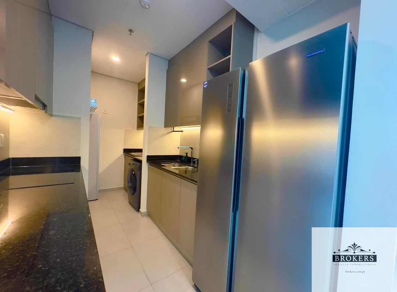 El departamento cuenta con 2 dormitorios, el principal en Suite, con sus placares, 2 baños con mampara cada una, Cocina integrada y amoblada