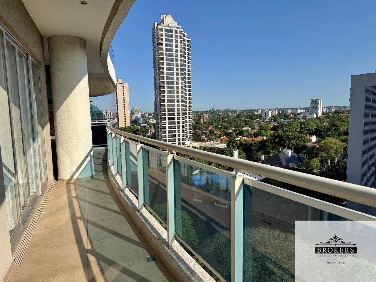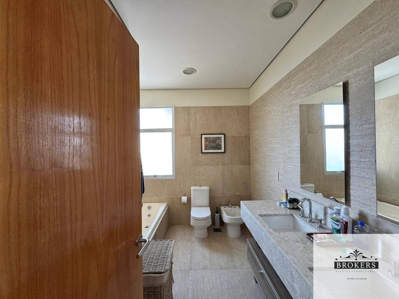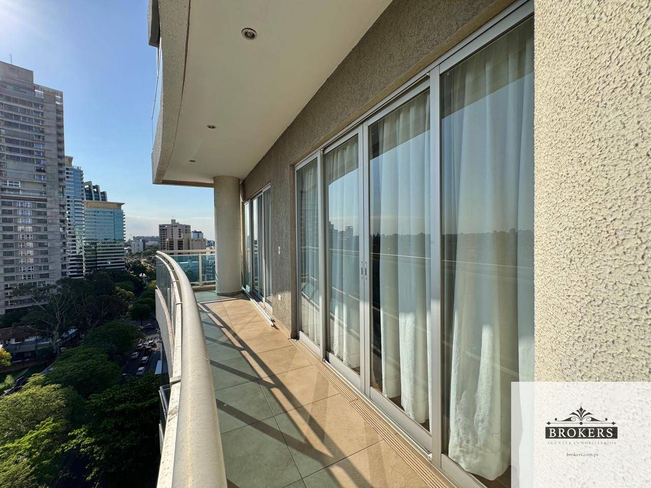 3 habitaciones; Una master suite y dos en suite, con balcón, Baños sociales, Cocina equipada, climatizada, Comedor, climatizado, Sala, climatizada, Área de servicio con dormitorio y baño, Área de lavado y planchado, Balcón amplio con parrilla,12 metros de largo, 2 unidades de cochera para vehículos grandes; 15 m2 c/u, 1 baulera; 5 m2