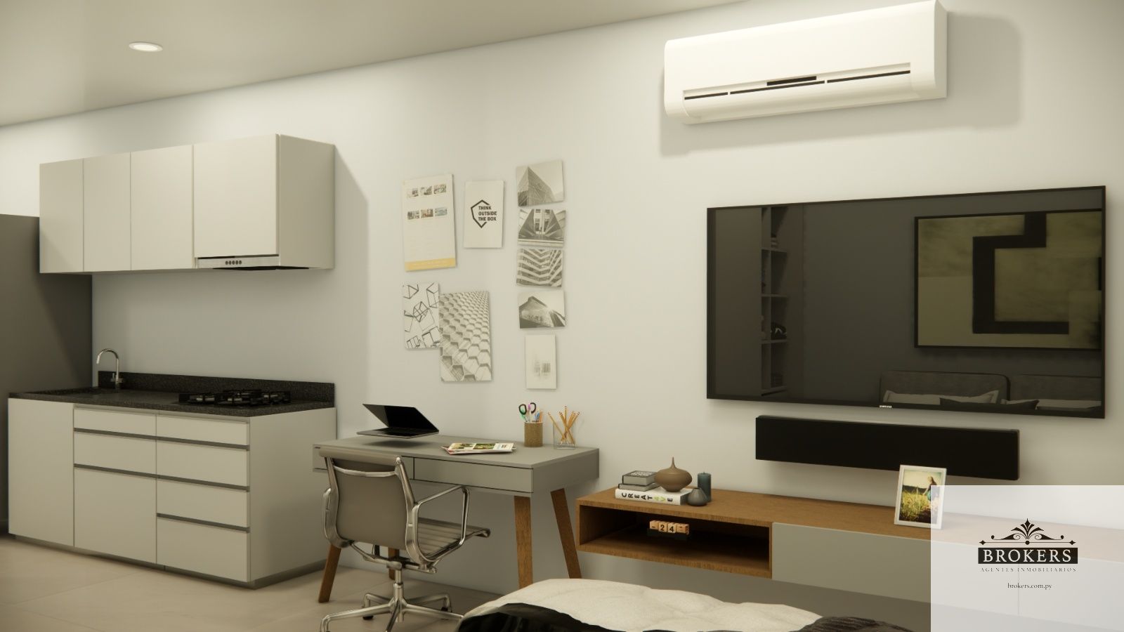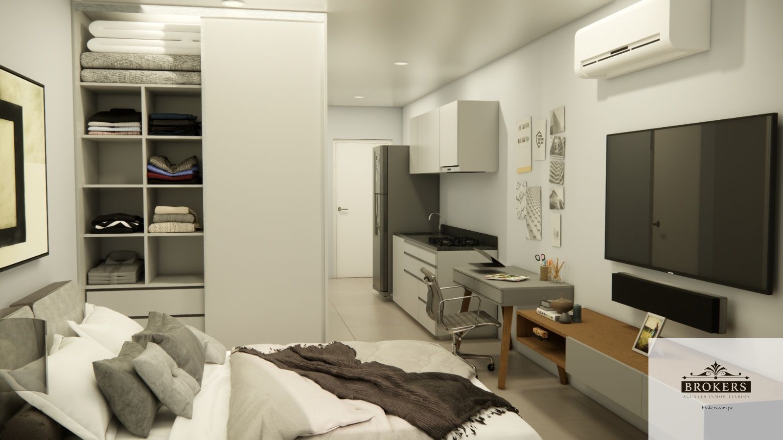 Incluido en el precio del monoambiente: la cerradura smart y el sistema de domotica para el manejo de las luces y el aire acondicionado, Muebles de cocina, 1 aire acondicionado y un placard.