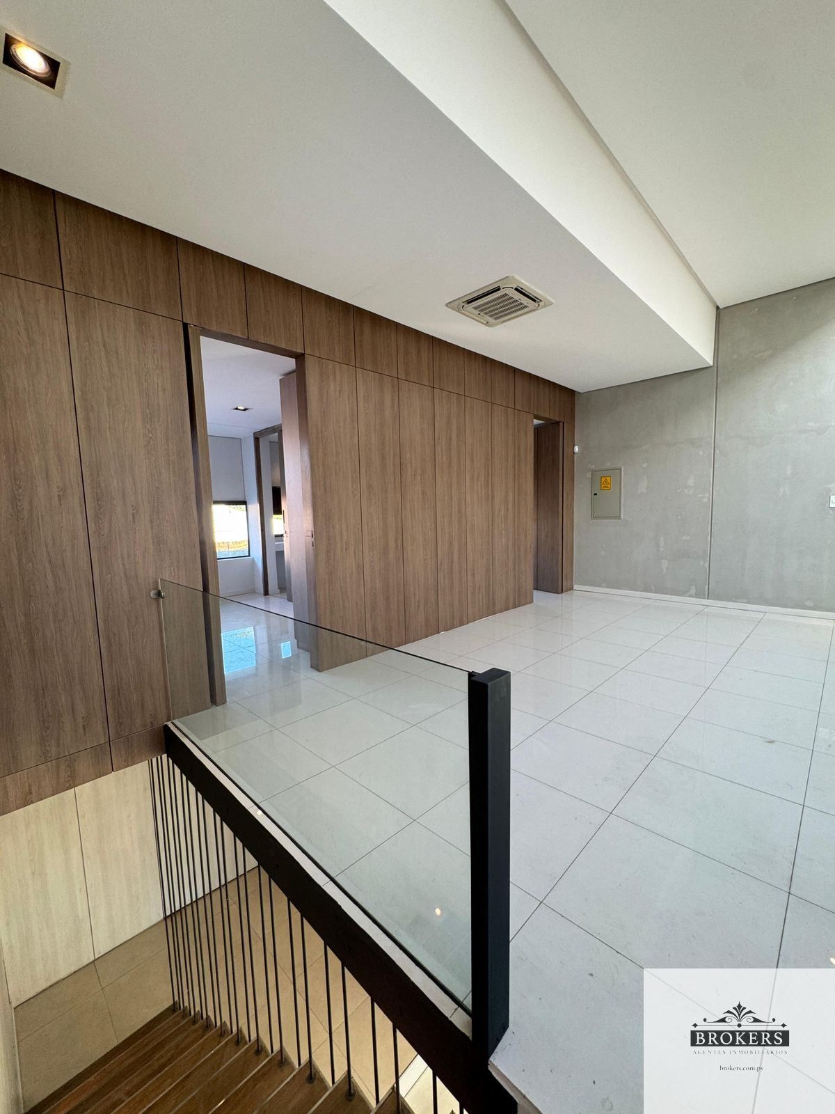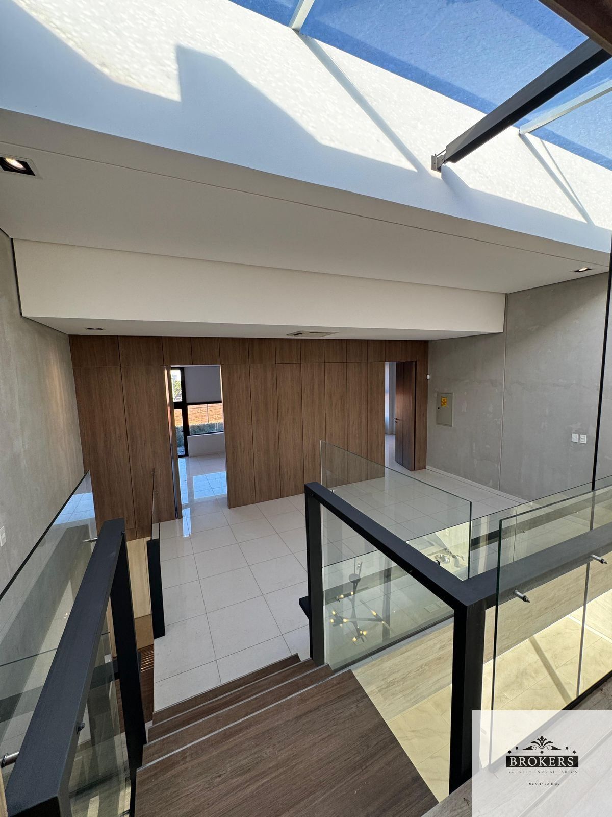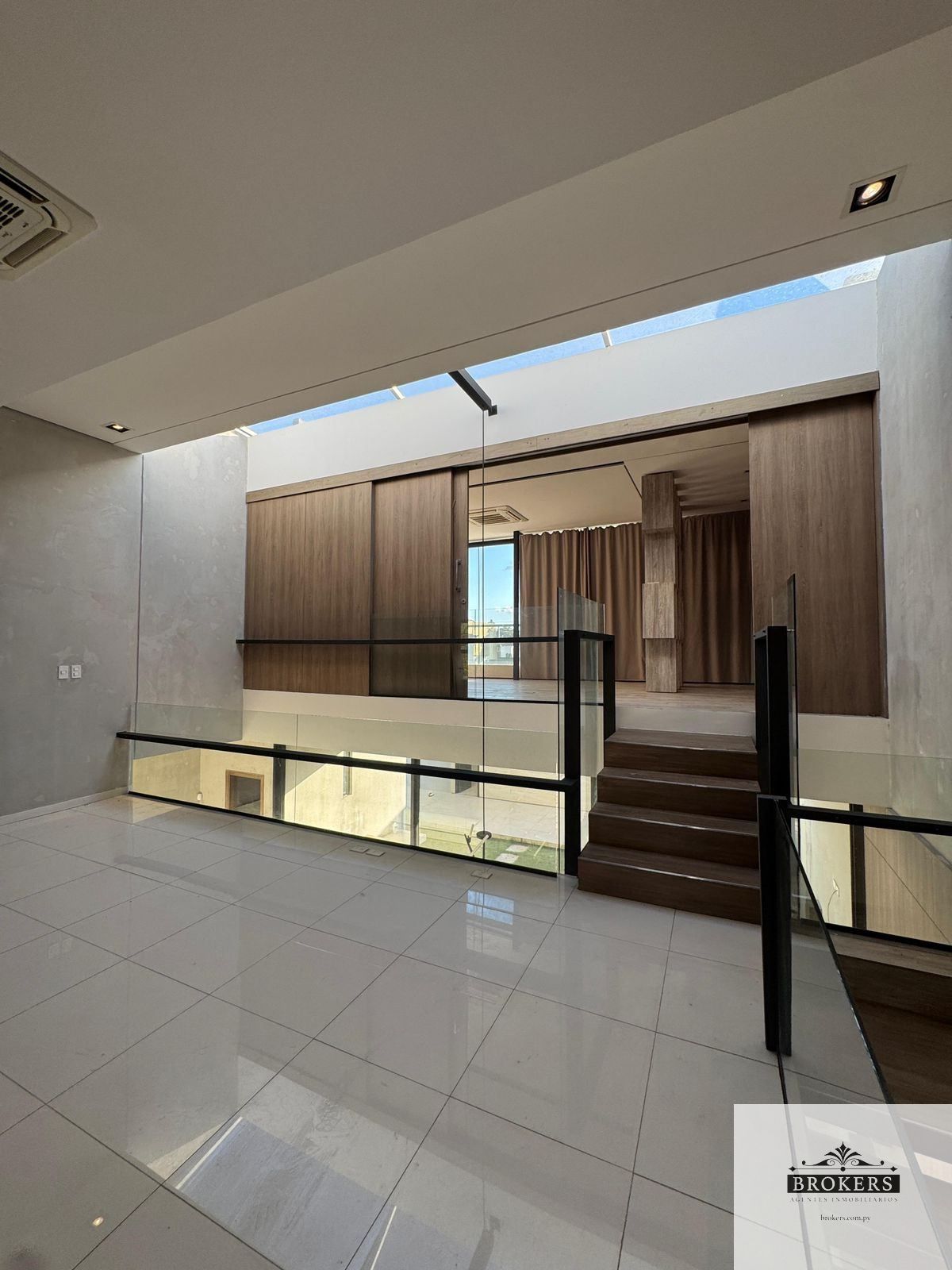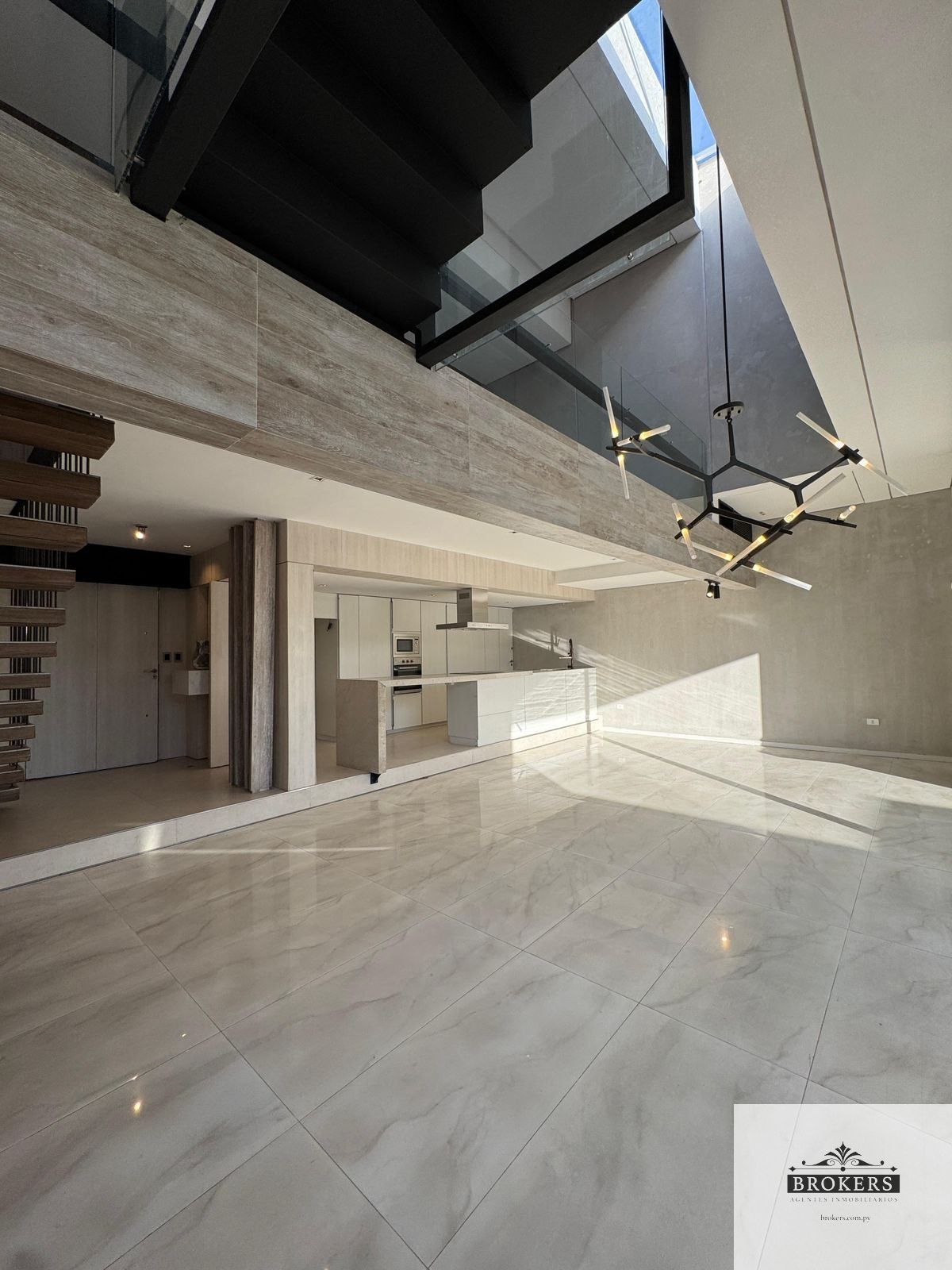 Sala con doble altura y diseño contemporáneo, Escalera flotante con barandas minimalistas, Iluminación cálida y de diseño, resaltando texturas y revestimientos
