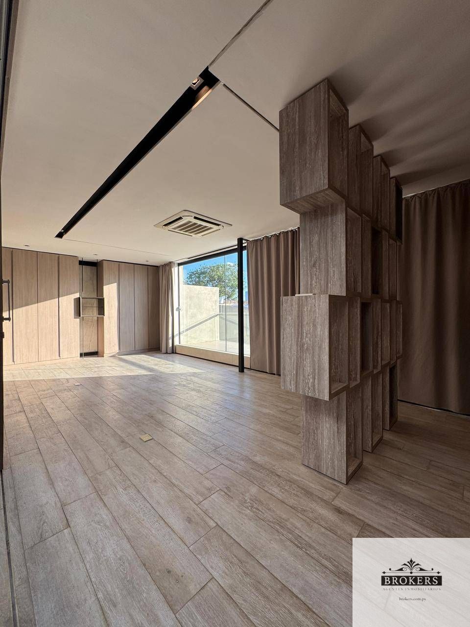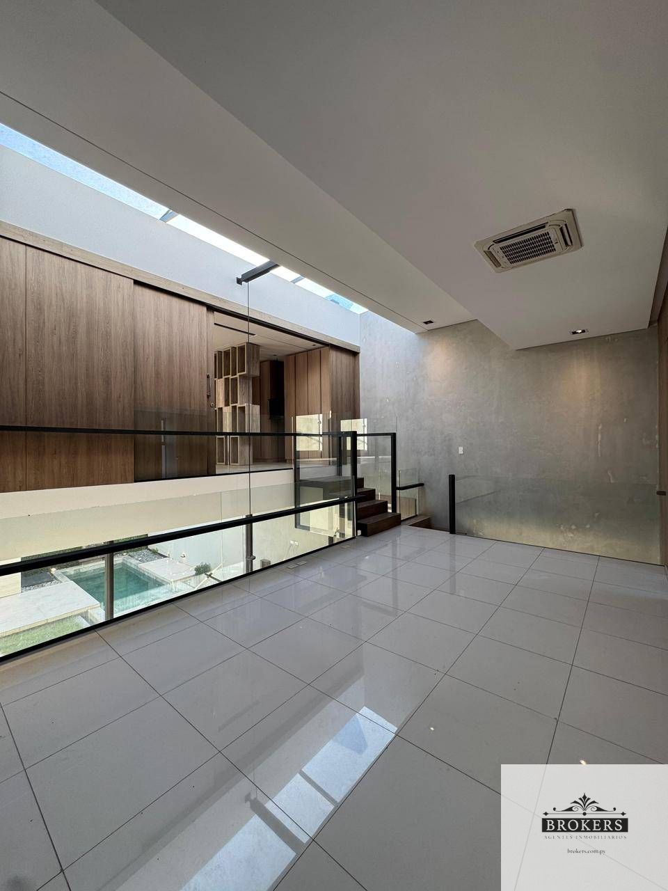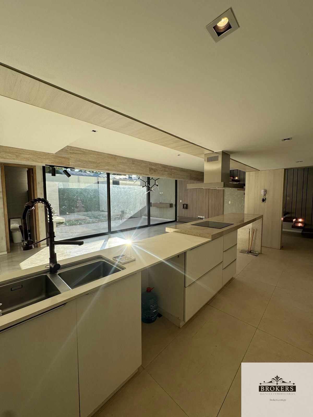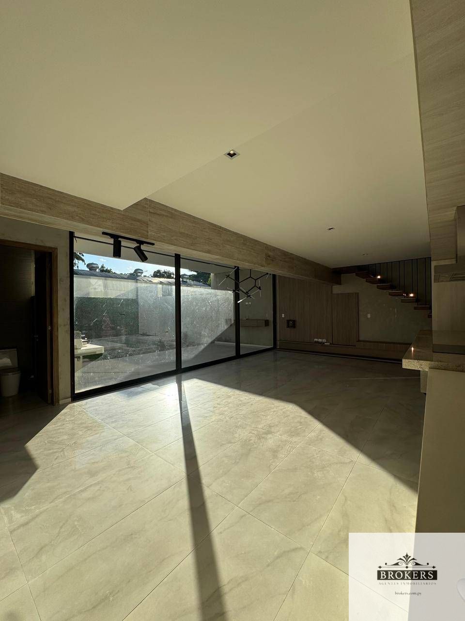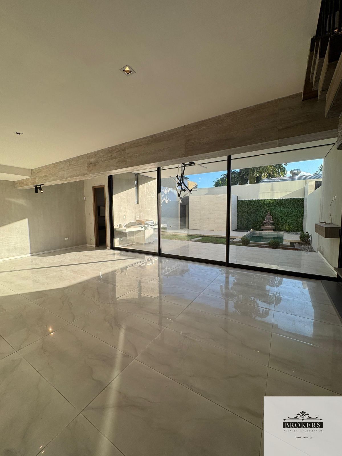 Muebles empotrados a medida, con nichos iluminados y detalles en madera natural, Ventanales de piso a techo que conectan toda la planta baja con el patio