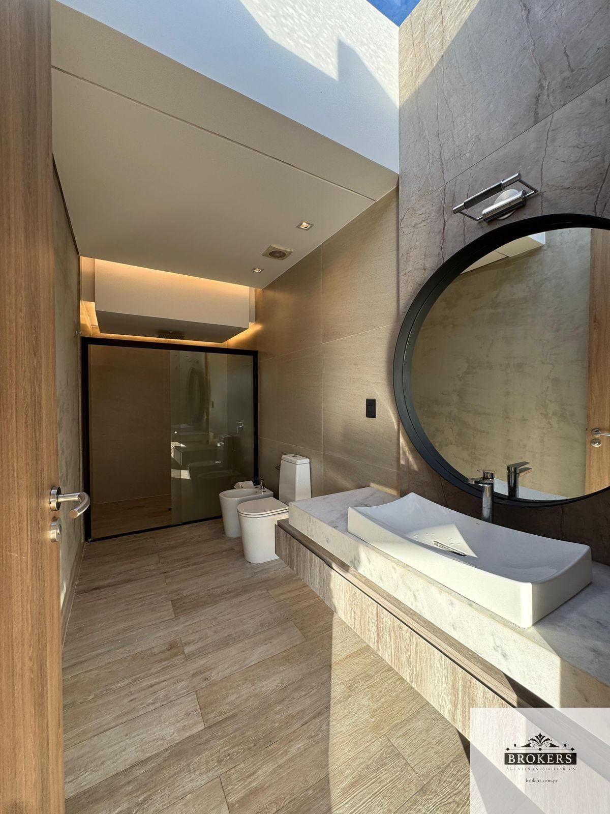 Placares, iluminación y revestimientos de diseño, Baños modernos, tonos neutros y materiales de calidad