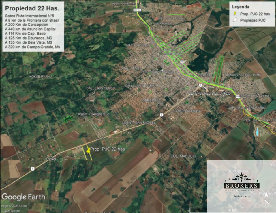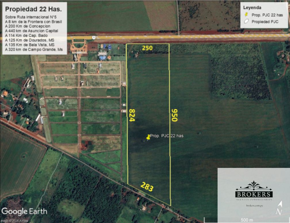 Excepcional terreno en venta de 22,27 hectáreas, estratégicamente ubicado sobre la Ruta Internacional N°5, uno de los corredores viales más relevantes del Paraguay, a tan solo 8 km de la frontera con Brasil. Esta propiedad se destaca por su ubicación privilegiada, lo que la convierte en una oportunidad única para emprendimientos logísticos, agroindustriales, industriales o proyectos de gran escala. El constante flujo de transporte nacional e internacional asegura un alto potencial de desarrollo.