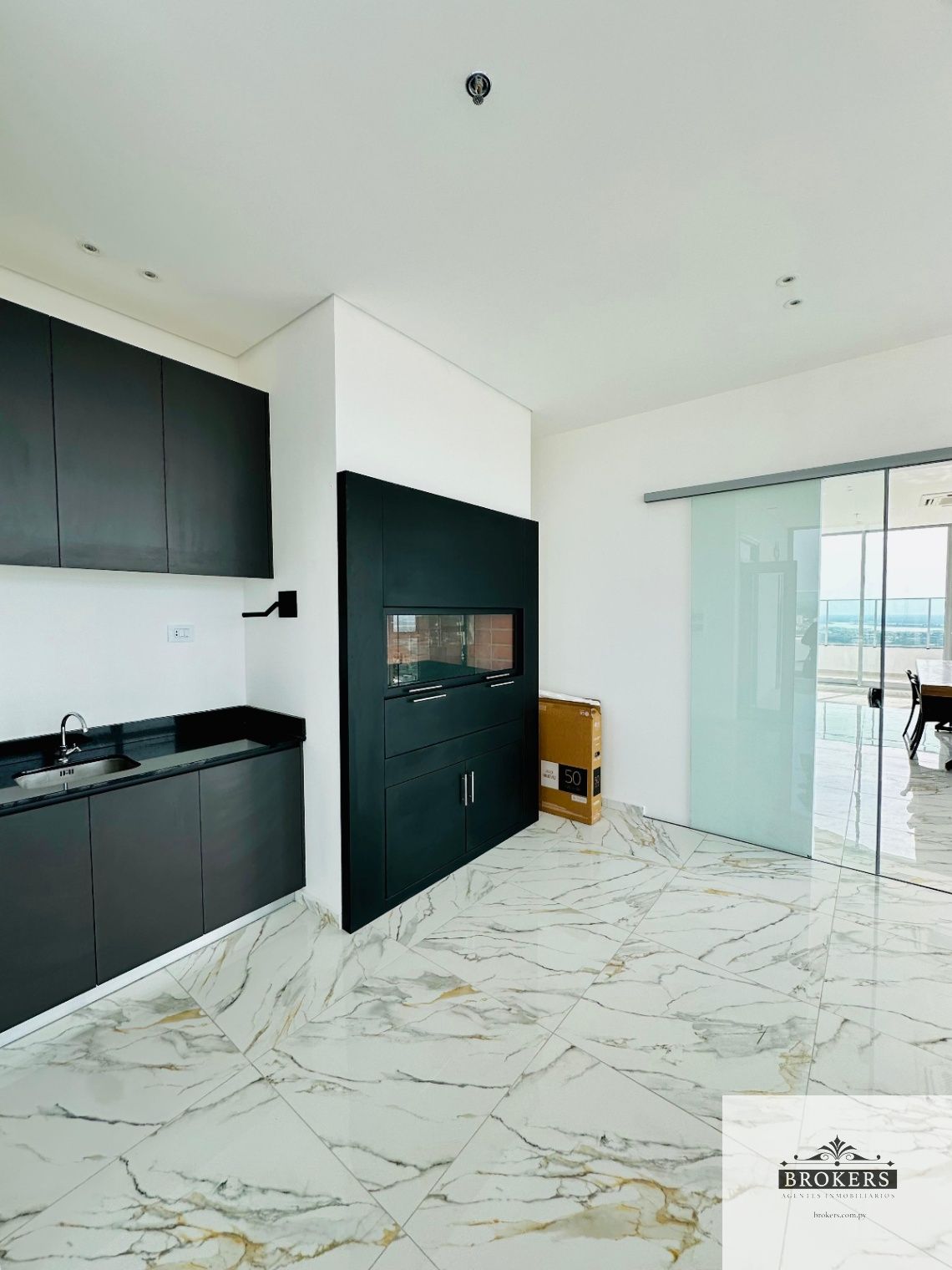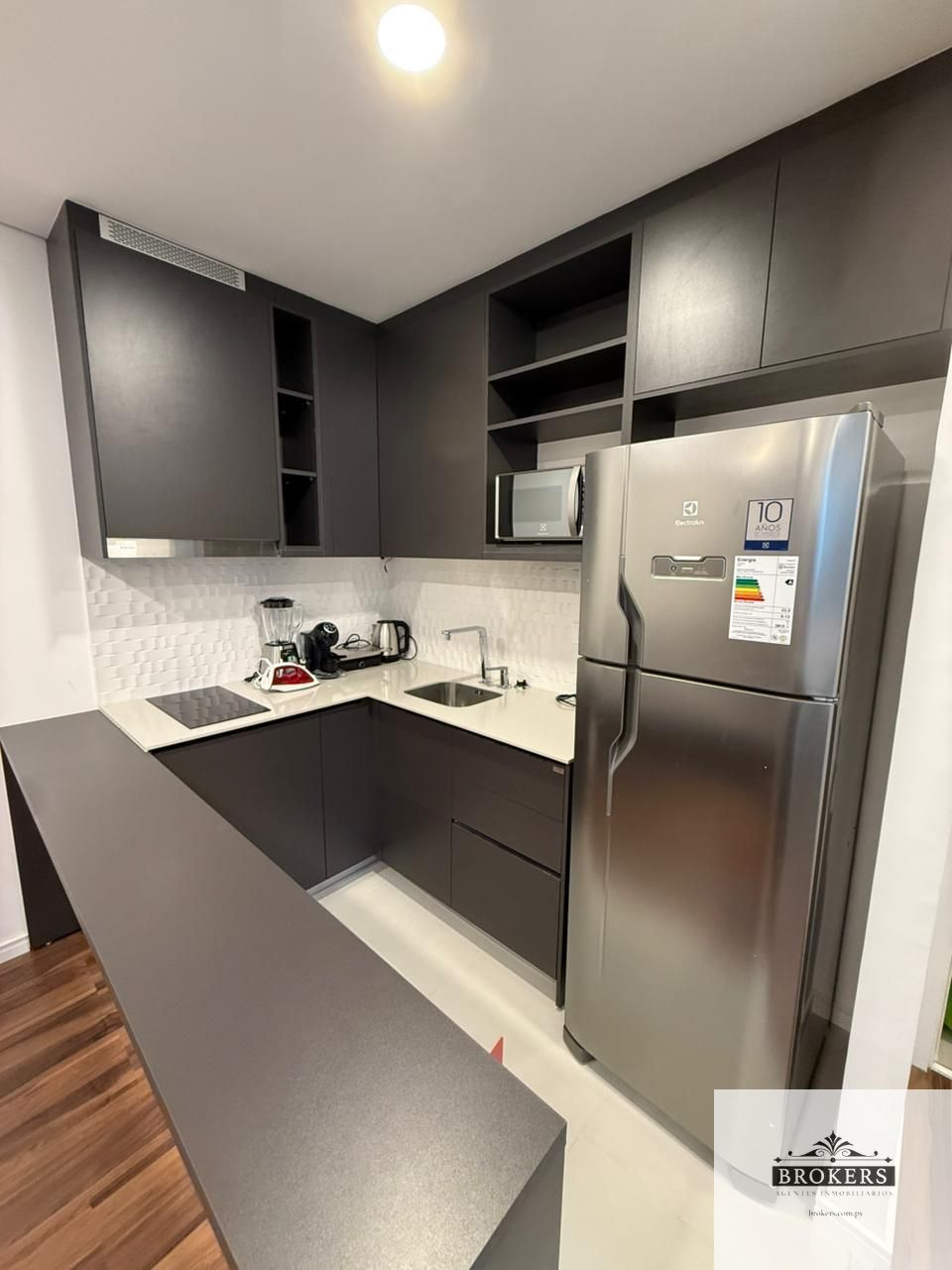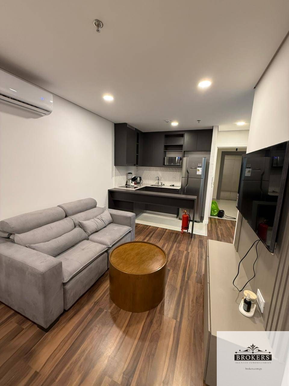 El departamento cuenta con living comedor con cocina integrada, balcón, lavarropas, un dormitorio, una cochera.