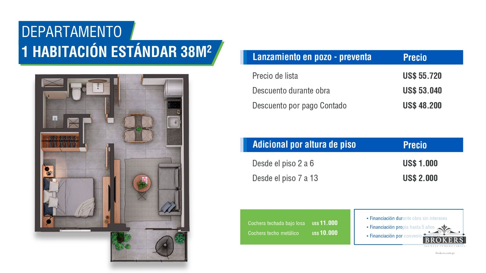 El edificio ofrece una variedad de amenities de primer nivel, que incluyen piscina, quincho, parrilla, solárium, terraza, y áreas de estacionamiento tanto cubiertos como al aire libre. Además, cuenta con seguridad las 24 horas, cámaras CCTV y portones de acceso eléctricos. Las cocheras están disponibles a precios competitivos, siendo USD 11,000 para cubiertas bajo losa y USD 10,000 para las de techo de metal. El proyecto facilita la compra mediante financiación durante la obra sin intereses, financiación propia de hasta 5 años, y opciones de financiación por convenio bancario.