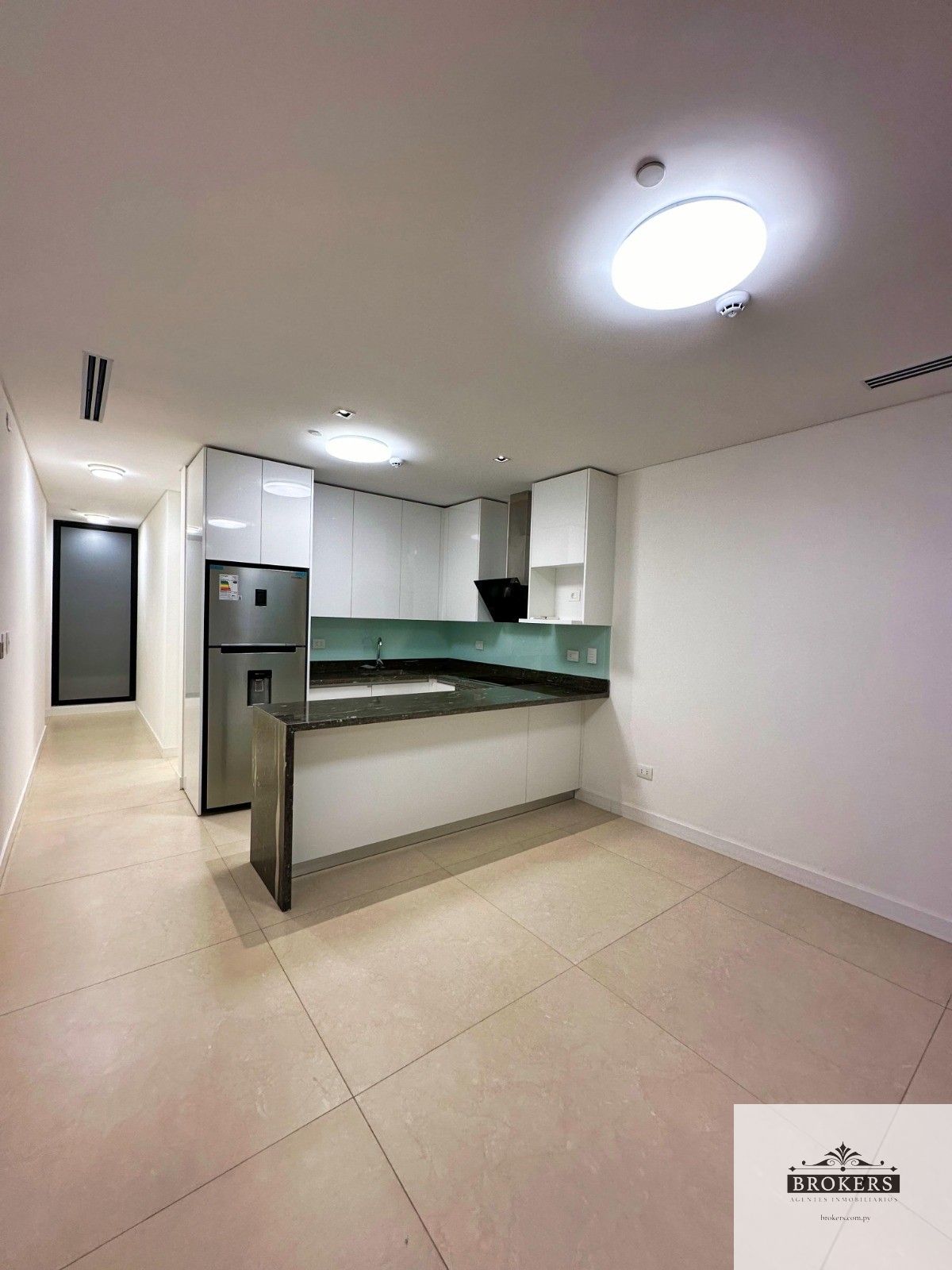 Dormitorio con mampara corrediza, Baño con inodoro de la marca One piece, Cocina semi amoblada con heladera, horno y anafe, Sala – comedor